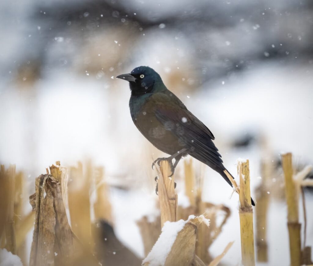 Snow is not everyone’s favorite, causing disruptions to daily life, electricity, and water. Yet there’s no denying the way it transforms visual opportunities for photographers. Its reflective surface creates natural fill light, ideal for capturing plumage details. Dark birds such as ravens, magpies, and dippers stand out as graphic elements against white backgrounds, while soft flakes add texture and atmosphere. Backlit snowfall can create halos around perched birds, and frost-covered branches offer natural framing. Winter rewards minimalism: the fewer elements in the frame, the more a bird’s posture, behavior, and expression — in birding circles, its “jizz” — can shine.
